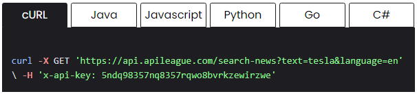 For each API you'll get multiple example code snippets that you can Copy in Paste into your IDE and run. No matter whether you code in Java, Javascript, Python, Go, or C#. If your language is not listed, you can either use cURL or one of the many SDKs.